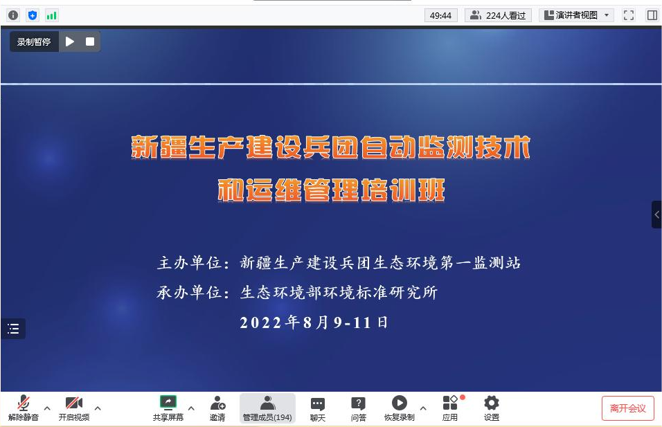 202289-11日,新疆生產(chǎn)建設兵團生態(tài)環(huán)境第一監測站委托生態(tài)環(huán)境部環(huán)境標準研究所,組織舉辦了“新疆生產(chǎn)建設兵團自動(dòng)監測技術(shù)和運維管理培訓班 ”,來(lái)自新疆生產(chǎn)建設兵團各區域監測站、各師監測站的業(yè)務(wù)骨干以及企業(yè)環(huán)保骨干累計415人線(xiàn)上參加了該次培訓。